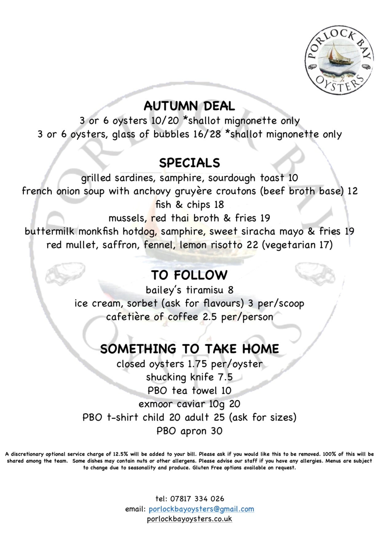Our ever-changing menu is centered around our Porlock Bay Oysters and other locally sourced shellfish and ingredients.